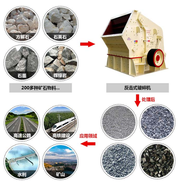 【適用物料】通常用來粗碎、中碎或細碎花崗巖、石灰石、混凝土、石灰石、煤、電石、石英、白云石、硫化鐵礦石、石膏和化工原料等中硬以下的脆性物料。